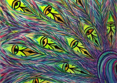 Colourful abstract paintings on feminism, gender, and queer sexuality. Through abstraction, they transform pain into power, reclaiming core wounding through electrified colour, fluid tubular shapes, and the queer body.